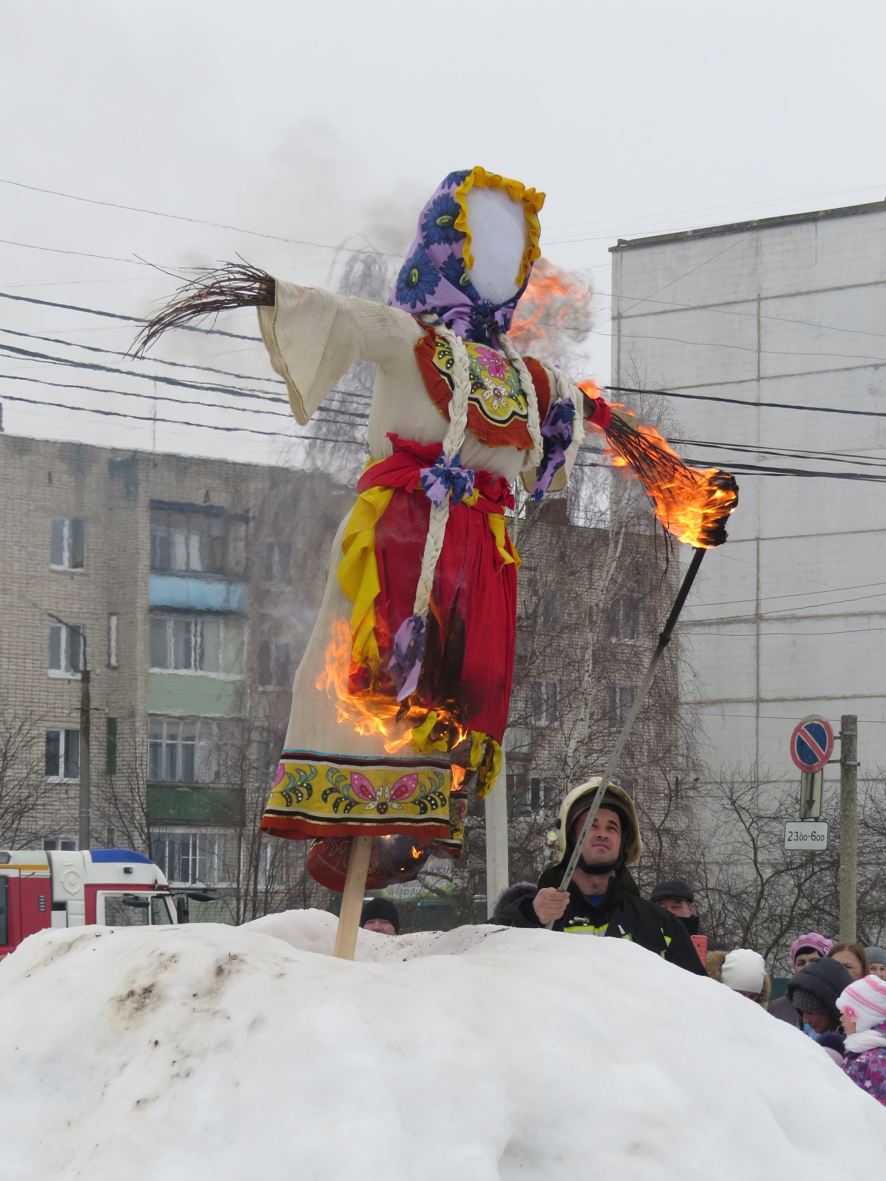 А кульминацией празднества стало сожжение чучела Масленицы, установленного на высоком снежном холме и хорошо видного отовсюду. Из-за влажной погоды поначалу оно никак не хотело разгораться, однако благодаря терпению и искусству пожарных и слаженно звучащей Масленичной закличке: «Гори-гори ясно, чтобы не погасло!», которую повторяли ребятишки, наконец, запылало.