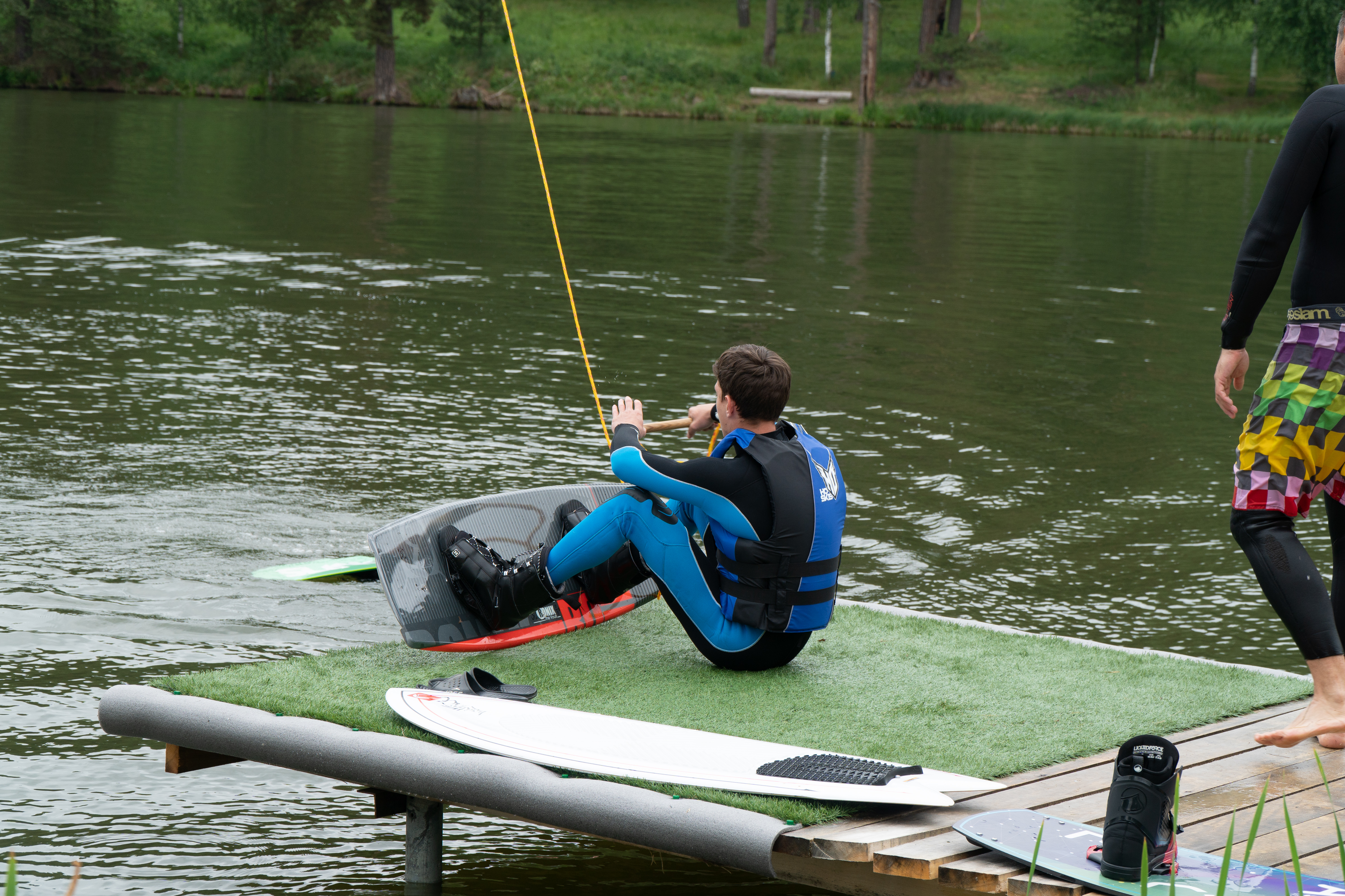 Уже в марте на одном из водоёмов базы отдыха была смонтирована реверсивная буксировочная установка отечественного производителя «Вертиго Спорт». К ней построили стартовую площадку. Закупили необходимый инвентарь.