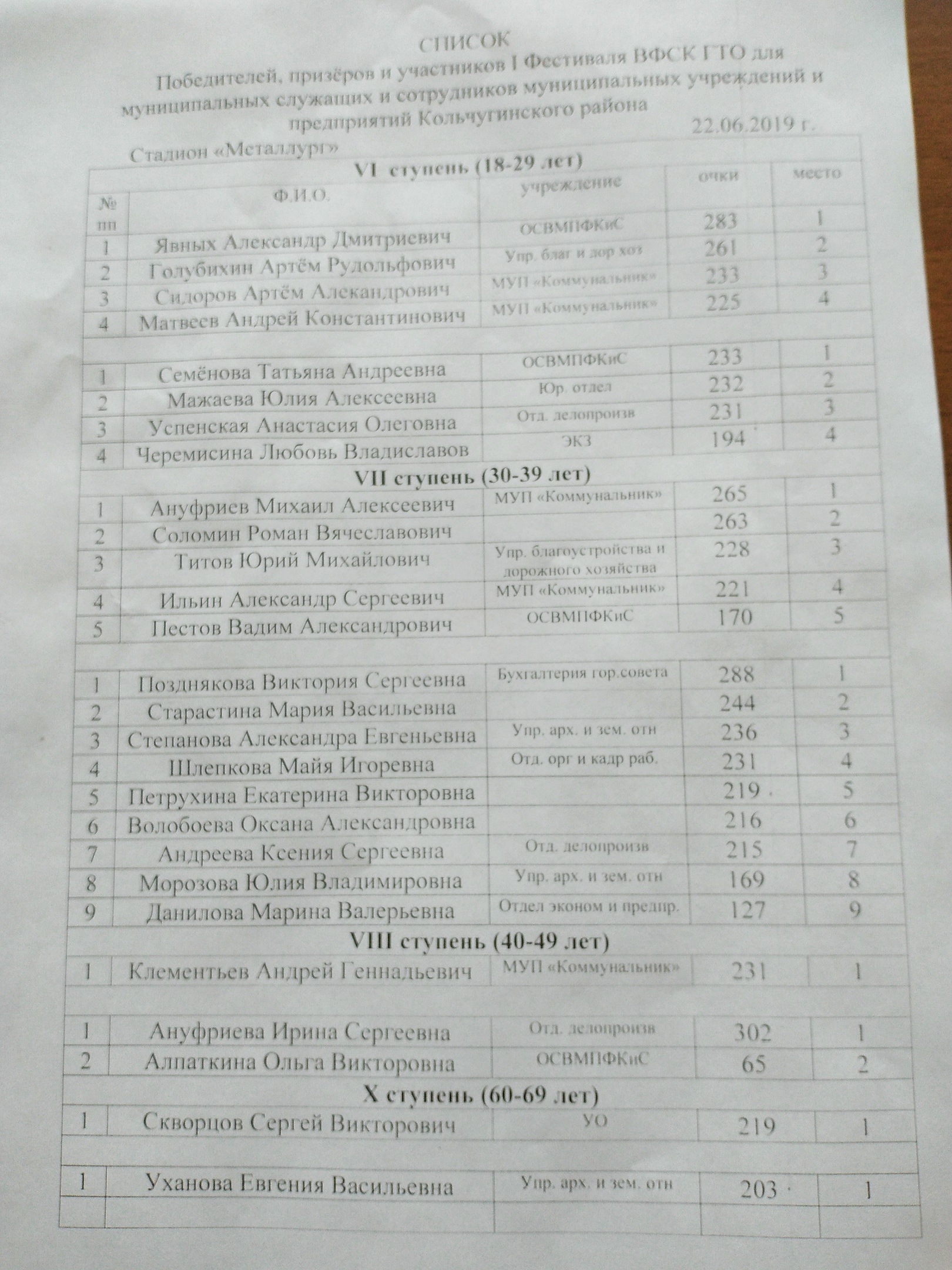 В Фестивале приняли участие свыше 30 человек с 6 по 10 возрастные ступени: отдел по социальным вопросам молодёжной политики физической культуры и спорта администрации Кольчугинского района, юридический отдел, отдел дело производства, отдел организационной и кадровой работы, отдел экономического развития и предпринимательства, бухгалтерия городского совета, а так же сотрудники Управления архитектуры и земельных отношений, Управление благоустройства и дорожного хозяйства и МУП “Коммунальник” и многие другие.