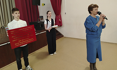 Директор школы Ольга Захарова продемонстрировала учащимся новую вывеску школы с именем Валентина Веденеева, которая с понедельника, 30 марта, висит на здании школы.